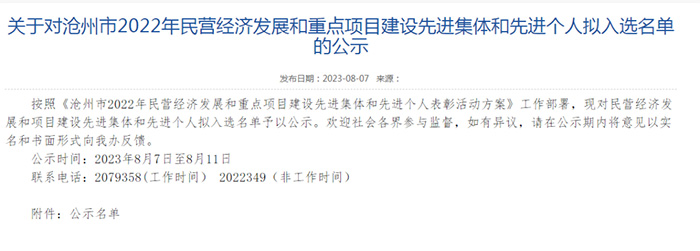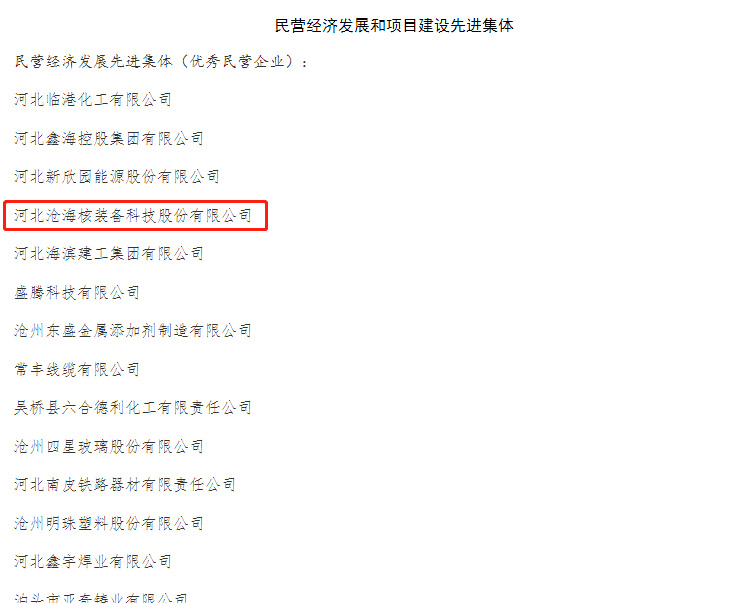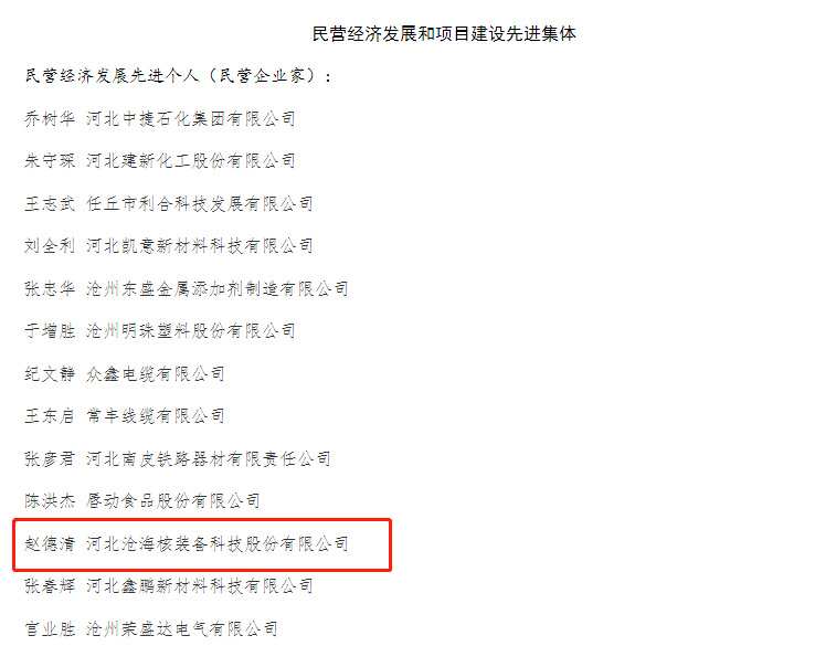 近日,河北滄海核裝備科技股份有限公司榮膺“2022年度滄州市民營經(jīng)濟(jì)發(fā)展優(yōu) 秀企業(yè)”榮譽(yù)稱號,董事長趙德清獲民營經(jīng)濟(jì)發(fā)展先 進(jìn)個人稱號。